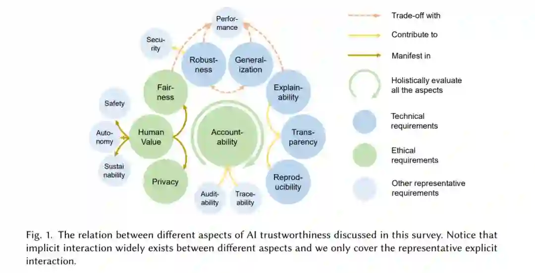 除了通过在不同的可信赖性方面建立可信赖的要求来追求人工智能的可信赖性,这些方面之间的交互是现实世界值得信赖的人工智能系统中一个重要且有待探索的话题。例如,对数据隐私的需求可能会干扰详细解释系统输出的愿望,而对算法公平性的追求可能会不利于某些群体体验到的准确性和稳健性。因此,仅仅贪婪地追求这些不同的方面并不一定会产生通向更可靠的AI系统的最佳解决方案。值得信赖的人工智能应该通过权衡和联合优化多个值得信赖的方面来建立。以上事实表明,有必要采取系统的方法来改变目前的人工智能范式,以获得可信赖性。这需要多学科相关者的意识和合作,相关者在系统生命周期的不同可信方面和不同阶段工作。为了帮助开发这种系统方法,我们以一种可访问的方式组织多学科知识,让人工智能从业者了解人工智能的可信赖性,并为构建可信赖的人工智能系统提供操作和系统的指导。我们的主要贡献包括: