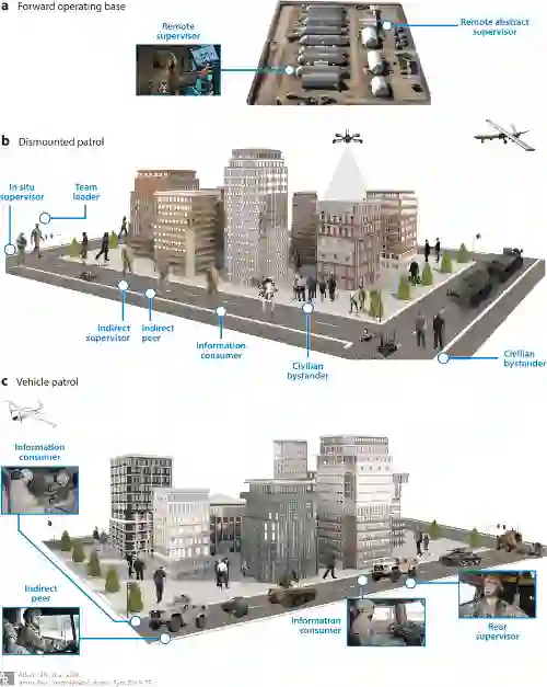 图 1 提供了角色图示,用于说明军事小故事。有些角色将驻扎在远离战场或事件响应区(也称为热区)的地方,在那里他们可以从更广阔的视角来了解需要管理的情况。如图 1a 所示,这类军事角色可能驻扎在前方作战基地。图 1b 和 c 显示了结合地面和空中机器人的两个部署示例,一个是徒步巡逻,另一个是乘车巡逻。这些示例展示了不同角色如何分布在一个军事单元中,并包括平民旁观者。