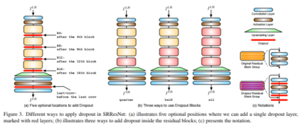 作者使用SRResNet作为基准模型探索如何进入Dropout操作,共考虑了三个因素:加入的位置,加入的比例,加入的方式。下图给出了dropout加入位置的示意图: * dropout before the last-conv ,见下图a,这也是本文最终的发现与结论; * dropout at middle of network ,见下图a; * dropout in residual network ,见下图c与b。