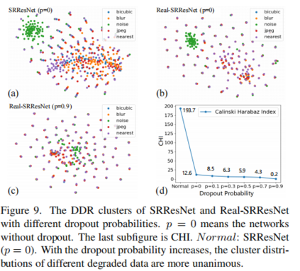 而引入Dropout后,本文采用DDR工具进行了泛化性分析。下图每一个点都代表对应不同退化方式的一张图,网络如果有较好的泛化性能,那么对于同一张高分辨率图,基于不同退化方式生成的low-resolution图,网络都能进行较好地超分。反映在下面的聚类图上,由于有5种退化方式,如果每个退化方式的点都非常靠近,聚成一类,表明网络更有专门解决这种退化方式的能力,例如(a)(b)图中的绿色点。