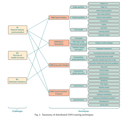 为了清晰地组织分布式GNN训练的技术,我们介绍了一种通用的分布式GNN训练管道,该管道由数据划分、GNN模型优化和梯度聚合三个阶段组成。前两个阶段涉及GNN特定的执行逻辑,包括图处理和图聚合。最后一个阶段与传统的分布式机器学习相同。在这个通用分布式GNN训练管道的背景下,我们讨论了分布式GNN训练的三个主要挑战,这些挑战是由图数据中的数据依赖性引起的,需要新的分布式GNN特定技术。为了帮助读者更好地理解解决上述挑战的各种优化技术,我们介绍了一种新的分类法,将这些技术分为四个正交的类别:GNN数据分区、GNN批处理生成、GNN执行模型和GNN通信协议。该分类法不仅涵盖了小批分布式GNN训练和全图分布式GNN训练中使用的优化技术,而且还讨论了从图处理到模型执行的技术。我们仔细回顾了每个类别中的现有技术,然后描述了23个来自业界或学术界的代表性分布式GNN系统和框架。最后,简要讨论了分布式GNN训练的未来发展方向。