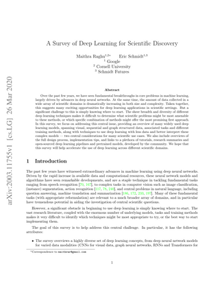 从辅助科学应用的角度,该综述详细描述了(i)使用较少数据的深度学习方法(自我监督、半监督学习等)和(ii)可解释性和表示分析技术(用于不仅限于预测任务)。这是两个引用和快速发展的研究领域,对于可能的科学用例也具有特殊的意义。