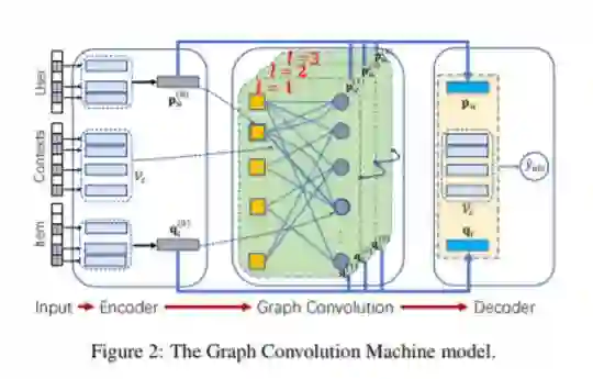 推荐的最新进展表明,可以通过在用户项目交互图上执行图卷积来学习更好的用户和项目表示形式。但是,这种发现主要限于协作过滤(CF)场景,在该场景中无法使用交互上下文。在这项工作中,我们将图卷积的优势扩展到了上下文感知推荐系统(CARS,代表了可以处理各种辅助信息的通用类型的模型)。我们提出了图卷积机(GCM),它是一个由以下组成的端到端框架:三个组件:编码器,图卷积(GC)层和解码器。编码器将用户,项目和上下文投影到嵌入向量中,然后将其传递到GC层,以利用上下文感知的图卷积在用户项图中对用户和项目嵌入进行细化。解码器通过考虑用户,项目和上下文嵌入之间的交互,提取经过精炼的嵌入以输出预测分数。我们对Yelp的三个真实数据集进行了实验,验证了GCM的有效性以及对CARS执行图形卷积的好处。