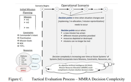 如图A所示,MMRA被设想为在确定的决策点由人在回路中激活。在这些事件中,MMRA系统用实时输入进行一次循环。由黑盒MMRA系统确定的输出被显示给人在回路中的人,以进行标准决策程序。虽然这项研究仅限于问题的分解,但未来的研究领域是开发一个由人类系统集成(HSI)驱动的产品实现。MMRA通过对日益复杂和相互依赖的资源分配问题进行客观评估,加强了指挥系统的决策。图B描述了MMRA人工智能系统过程的行动图。