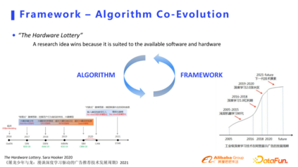 而这就会引发另一个有意思的现象:框架与算法共同进化。框架和算法实际上是相辅相成,是共同进化迭代的一个过程。我们在整理广告组过去4-5年的经历的时候发现:这个演化过程确实是有周期性的。 工程框架的发展是跟整个算法的红利包括跟整个业务的发展都有关联的。算法侧提出了一个新的结构,框架就需要去做适配和推理优化。框架的革新又会导致算法工程师可以去尝试更复杂更加有意思且更有深度的想法。整个过程就是一个共同进化共同演化的过程。正如Hardware Lottery里所说的那样:“一个研究性想法的取胜是因为当下它更好地适配了已有的软件和硬件”。反之,一个框架是否被广泛应用,也是因为它非常好地响应了当前算法的发展趋势。正如 pytorch 被越来越广泛地应用,也是因为它更适合用来实验新的模型结构。