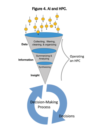 这项工作的目的是研究人工智能和HPC一起工作,以推进关键的军事能力,如态势感知(图4)。边缘的HPC加人工智能提供了对本地数据的近乎实时的利用,支持高度的自主性,计算资产被移到离数据源更近的地方,增加了数据分析的深度和广度,减少了做决定的时间,洞察力为决策提供了依据。