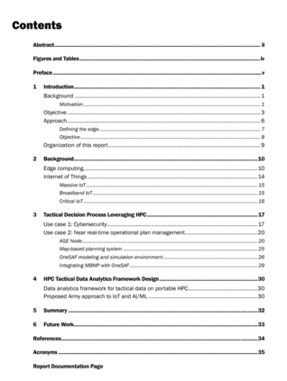 战术边缘人工智能(AI)的方法被细分为三个主要研究领域:(1)研究延伸到战术边缘的移动或便携式高性能计算(HPC)环境的硬件和架构;(2)研究机器学习(ML)算法和物联网(IoT)架构及其与便携式HPC的一致性;以及(3)利用边缘HPC为战术决策过程设计操作工作流框架。