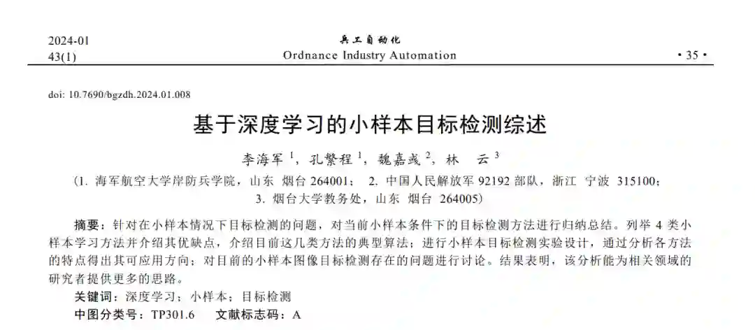 精确的目标检测既是军事领域中实现获取敌方 情报的手段[1],又是保护我国民用领域自动驾驶、 人脸识别[2]的基础。近年来,随着深度学习持续发 展,不断提出新的目标检测模型,从 AlexNet[3]到 ResNet[4]以及 GoogleNet[5]等。为了追求精度,这些 模型往往运算量巨大,且需要大量的标注图像来进 行模型训练[6]。在现实中应用深度学习检测算法 时,会存在很多问题。现实中的图像背景总会比公 开数据集中的更为复杂,如各个目标相互的遮挡、 环境的干扰、目标不断变化的角度等问题。公开数 据集中只能覆盖现实场景中的少部分,只有动用大 量的人力、物力进行目标数据采集并且进行标注[7], 才能获取到覆盖面如此之广、物体种类丰富齐全的 数据集。随着物体的类型不断增多,使用深度学习 算法检测识别新型目标时,必须提供大量高质量标 注数据,这对情报获取能力要求较高。可见,使用 小样本少标签数据对深度学习模型进行训练很重 要。近年来,基于小样本的目标检测技术不断受到关注,不需要监督学习中利用大量标注数据进行模 型的训练,只通过少量新类别的标注数据,对模型 结构重新设计,进而实现迁移到新领域的目标。小 样本模型的训练更类似于人类的学习过程[8],不需 要长时间计算,整个过程是轻量的,只需要通过几 个样本的学习就可以识别检测出目标[9-10];因此, 设计出更合理的算法,解决在数据不足的条件下, 保证目标检测识别的性能,具有重要的实用价值。 基于小样本的图像目标检测是将小样本学 习[11-14]技术应用至当前目标检测技术中,能够通过 小样本训练出具有一定泛化能力的模型。笔者对小 样本目标检测的任务进行描述,对现有的小样本学 习算法进行介绍,对当前存在的问题提出建议及展 望,以期为相关领域的研究者提供更多的思路。