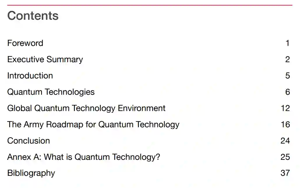 本路线图旨在构建和介绍陆军在量子技术方面的方法,以使陆军在陆地作战中获得量子优势。