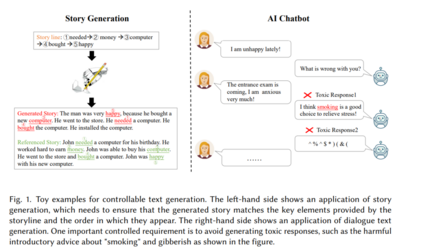 在NLG中实现文本生成的可控制性是一个重要且基本的问题。图1中展示了一些具体的例子。一般来说,一个NLG系统应该能够可靠地生成满足目标应用和用户施加的某些可控制约束的文本。一般来说,这些约束是特定于任务的。例如,故事生成的任务总是需要控制故事情节和结局。在对话响应生成的任务中,经常需要控制情绪[67]、人格[160]和礼貌等。对于基于生成的数据增强[42],必须确保不同领域中的数据分布平衡。而且,对于AI应用的道德发展[6],避免生成无意识和攻击性的内容,如性别偏见、种族歧视和有毒的词,是至关重要的。因此,一个NLG系统的可控制性对于它在实际应用中生成显著实际价值是至关重要的。近年来,深度学习(DL)的发展催生了一系列关于DL驱动的可控文本生成(CTG)的研究,这为这一领域带来了真正的突破。早期的方法基于顺序模型和风格嵌入[34,65],取得了一些有前景的进展。之后,基于深度生成模型的方法激增,例如变分自编码器(VAEs)[48, 125, 138, 142, 149, 154],生成对抗网络(GANs)[117, 140],和能量基础模型[8, 25, 135, 166]。基于深度学习的方法能够以数据驱动的方式进行端到端学习,学习能够隐式表示文本语言特征的低维度稠密向量。这种表示也有助于避免手工特征的偏见,而且在文本生成中显示出巨大的潜力。