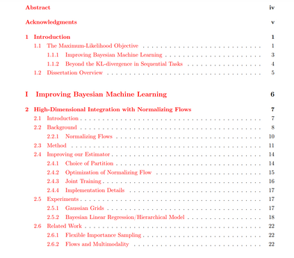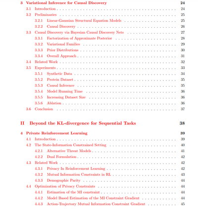 最后,最大似然通常与下游任务目标高度一致。例如,在ImageNet发布后变得流行的分类任务中 [DDS+09],最大化正确标签的概率正是训练分类模型的目标。 然而,最大似然目标并不总是最合适的选择。不幸的是,采用非基于似然的目标通常是具有挑战性的。在现代机器学习中,方法的可扩展性和优化的便捷性是所有方法的重要考虑因素。我们面临的挑战是:找到超越最大似然方法的技术,同时保持数据效率、易于通过梯度下降优化,并具备计算扩展性。为了解决这个问题,我们利用了一些在本论文中提出的关键技术:变分推理用于神经函数逼近下的贝叶斯推断,连续松弛和路径梯度估计器用于减少优化中的方差,以及将问题重新参数化为更易处理的等价形式。 本论文分为两部分,但有一个共同的目标:开发超越典型MLE方法的技术。在第一部分中,我们研究了贝叶斯机器学习的改进,尤其在数据较少的情况下,由于数据集的有限性,关于θ的值可能存在相当大的不确定性。首先,我们开发了一种使用正则化流计算高维积分的新方法,并将其应用于计算贝叶斯定理中的归一化函数。然后,我们将变分推理应用于因果发现问题,解决了在复杂有向无环因果图集中构建后验分布的挑战。 在第二部分中,我们研究了在序列任务中超越最大似然的替代训练方法。首先,我们研究了在强化学习中执行隐私约束的问题。这需要控制策略生成的轨迹分布,以确保它们不会泄露有关私有状态变量的信息。最后,我们解决了基于序列数据的自回归模型训练问题。我们将任务重新表述为模仿学习任务,从而可以有效地最小化与数据分布的不同散度。超越MLE方法还为生成过程提供了额外的灵活性,我们通过允许回溯来增强生成过程。