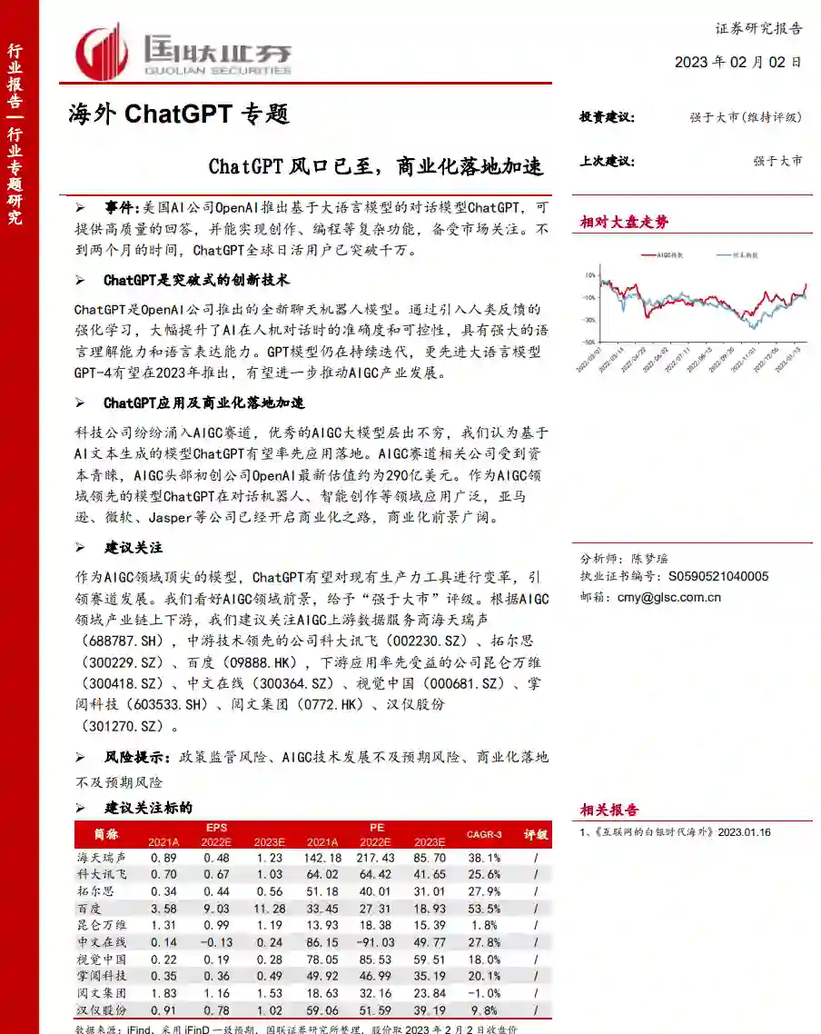 事件:美国AI公司OpenAI推出基于大语言模型的对话模型ChatGPT,可提供高质量的回答,并能实现创作、编程等复杂功能,备受市场关注。不到两个月的时间,ChatGPT全球日活用户已突破千万。