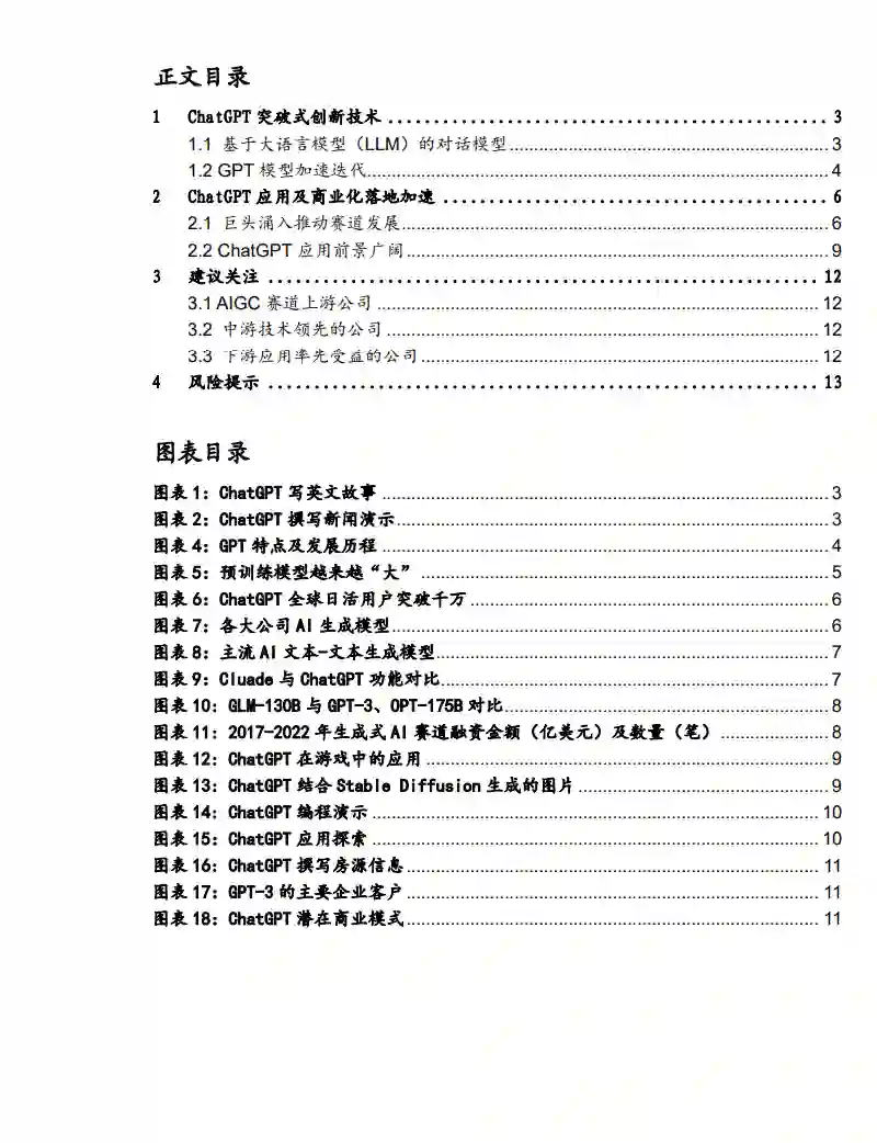 ChatGPT是突破式的创新技术ChatGPT是OpenAI公司推出的全新聊天机器人模型。通过引入人类反馈的强化学习,大幅提升了AI在人机对话时的准确度和可控性,具有强大的语言理解能力和语言表达能力。GPT模型仍在持续迭代,更先进大语言模型GPT-4有望在2023年推出,有望进一步推动AIGC产业发展。 ChatGPT应用及商业化落地加速科技公司纷纷涌入AIGC赛道,优秀的AIGC大模型层出不穷,我们认为基于AI文本生成的模型ChatGPT有望率先应用落地。AIGC赛道相关公司受到资本青睐,AIGC头部初创公司OpenAI最新估值约为290亿美元。作为AIGC领域领先的模型ChatGPT在对话机器人、智能创作等领域应用广泛,亚马逊、微软、Jasper等公司已经开启商业化之路,商业化前景广阔。