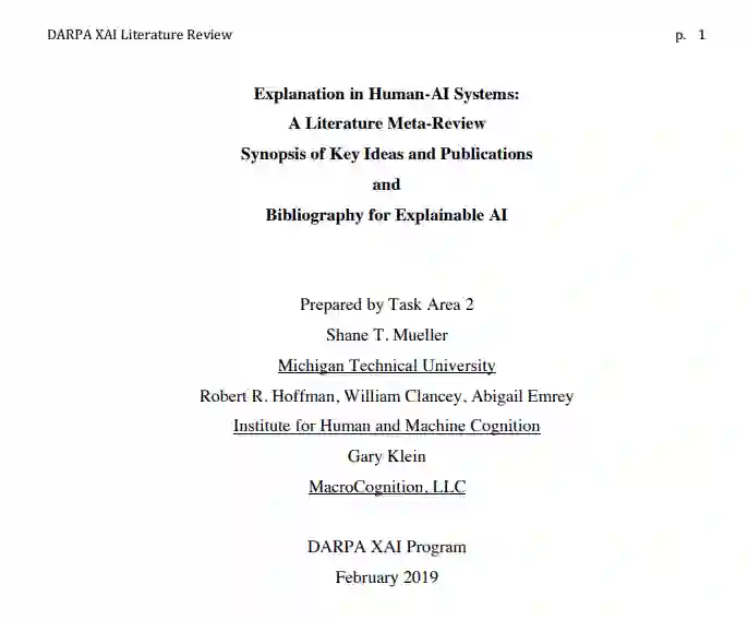 本报告是对之前关于DARPA XAI项目的报告的扩展,该报告的标题是 "可解释人工智能关键思想的文献回顾和整合",日期是2018年2月。这个新版本整合了已经发现的近200个额外的参考文献。本报告包括一个新的部分,题为 "对XAI系统的人类评价的审查"。这一节重点介绍了人机人工智能或XAI系统经历了某种实证评估的项目报告--其中许多是最近的。这个新部分与DARPA XAI项目的经验和实验活动特别相关。