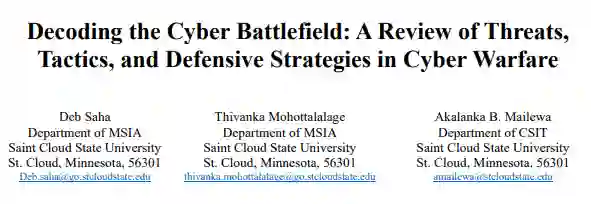 网络战已迅速演变为现代冲突的主导形式,它超越地理边界和传统战争范式。“揭秘网络战:威胁、战术与防御”是对这一动态领域的全面审视,深入剖析了网络威胁的多维图景。本文深入探讨了政府、组织及个人所面临的各式网络威胁。从从事间谍活动与破坏的国家行为体,到为经济利益利用漏洞牟利的网络犯罪分子,对手谱系广泛且持续演变。理解这些威胁行为体的动机、能力与战术对于制定有效防御策略至关重要。本文探究了网络对手所采用的复杂战术。它深入剖析社会工程学、恶意软件传播及零日漏洞利用领域,展现了攻击者的独创性与适应性。此外,它强调了国际协作与公私合作伙伴关系在应对网络战这一全球性挑战中的必要性。“揭秘网络战”汲取网络安全专家、军事战略家及政策制定者的见解,为驾驭网络冲突的复杂性提供了一份全面的路线图。它赋予利益相关者必要的知识、工具和框架,以在持续网络威胁定义的时代中预见新兴威胁、调整防御策略并培育更安全的数字生态系统。在这篇综述中,我们旨在探讨若干关键研究问题,以阐明网络战的多维本质。首先,网络战场上有哪些新兴威胁,包括已知漏洞和新型攻击向量?其次,对手如何利用高级战术(如社会工程学、恶意软件传播和零日漏洞利用)来渗透网络并破坏系统?此外,目前采用哪些防御策略与技术来挫败网络攻击,其优势与局限何在?再者,地缘政治因素(包括国家支持的网络行动和网络间谍活动)如何影响网络战的格局?最后,网络战对国家安全、关键基础设施保护和国际关系有何影响?政策制定者与利益相关者如何有效缓解这些风险?通过对这些研究问题的深入探讨,本综述旨在为网络战不断演变的动态提供有价值的见解,并为未来加强网络安全韧性、缓解网络威胁的努力提供信息。