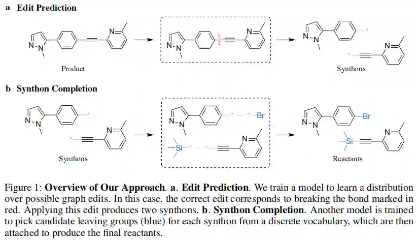 我们的方法利用了图拓扑从产物到反应物基本不变的特性。为了实现这一点,我们首先从被称为合成子的产物中获得合适的构建块,然后通过添加leaving groups,将它们完成成有效的反应物。我们首先训练一个神经网络来预测可能的编辑的分数。然后将得分最高的编辑应用于产物,以获得合成子。由于唯一的leaving groups的数量较少,我们将leaving groups的选择建模为预先计算的词汇表上的一个分类问题。为了产生候选反应物,我们通过化学约束规则将预测的离去基附加到相应的合成物上。图1概述了整个过程。