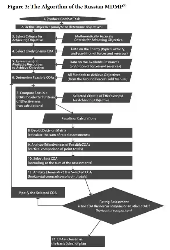 本文探讨了俄罗斯军队决策过程的复杂轮廓,以及所涉及的各种影响因素,以及俄罗斯的经验与北大西洋公约组织(NATO)军队的做法或标准方法有什么不同,有时是生动的。本文有意避免研究军事决策的理论,而集中讨论谁参与其中以及如何处理这一复杂过程的实际问题。它的目的是为北约内部的国防规划者和军事决策者提供信息,以便更好地理解俄罗斯武装部队这一过程的性质。特别是,以下研究试图确定俄罗斯武装部队在提高军事决策的速度和有效性方面正在取得明显进展的领域,并探讨莫斯科仍然面临的一些挑战和脆弱性。