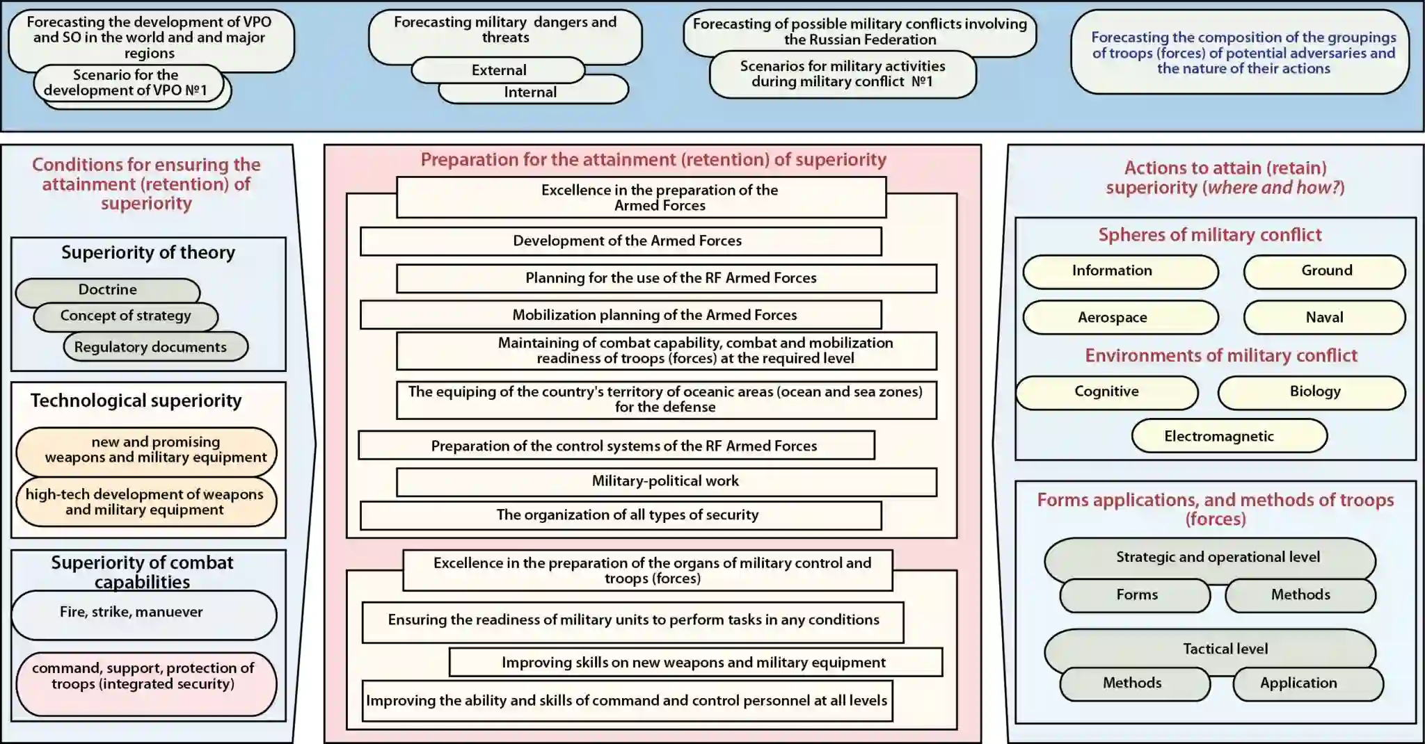 俄罗斯现代军事能力的进步很大程度上是受到源自苏联军事理论家的军事思想的影响。这延续了强调军事科学在国防规划中的作用的传统,它鼓励对未来战争的思考,发展战略远见,并不断修正和努力预测未来可能发生的战争。
