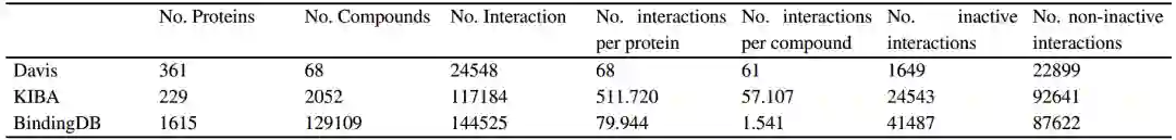 4.1 数据作者采用了3个流行的数据集用于评估模型:KIBA数据集、Davis数据集、Binding DB数据集。数据的统计情况如表2所示。表2 使用的3个数据集的统计情况