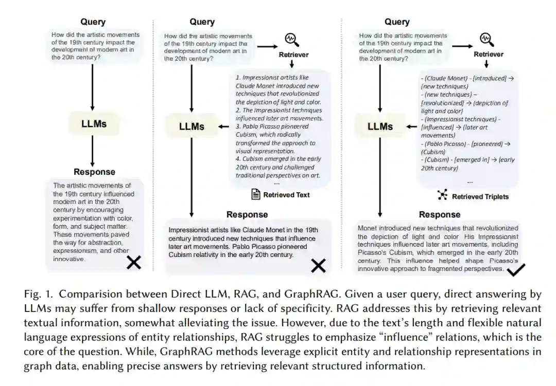 图检索增强生成(GraphRAG)[25, 50, 108]作为一种创新解决方案,旨在应对这些挑战。与传统的RAG不同,GraphRAG从预构建的图数据库中检索与给定查询相关的图元素,如图1所示。这些元素可能包括节点、三元组、路径或子图,并用于生成响应。GraphRAG考虑了文本之间的相互联系,使得关系信息的检索更加准确和全面。此外,图数据(如知识图谱)提供了对文本数据的抽象和总结,从而显著缩短了输入文本的长度,缓解了冗长问题。通过检索子图或图社区,我们可以获取全面的信息,利用图结构中的广泛上下文和相互联系来有效应对QFS挑战。