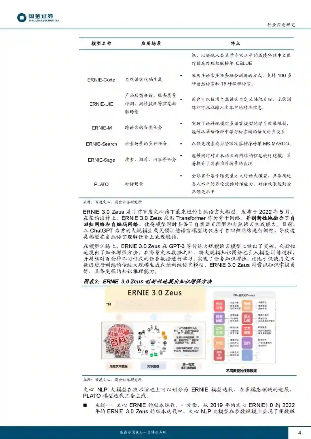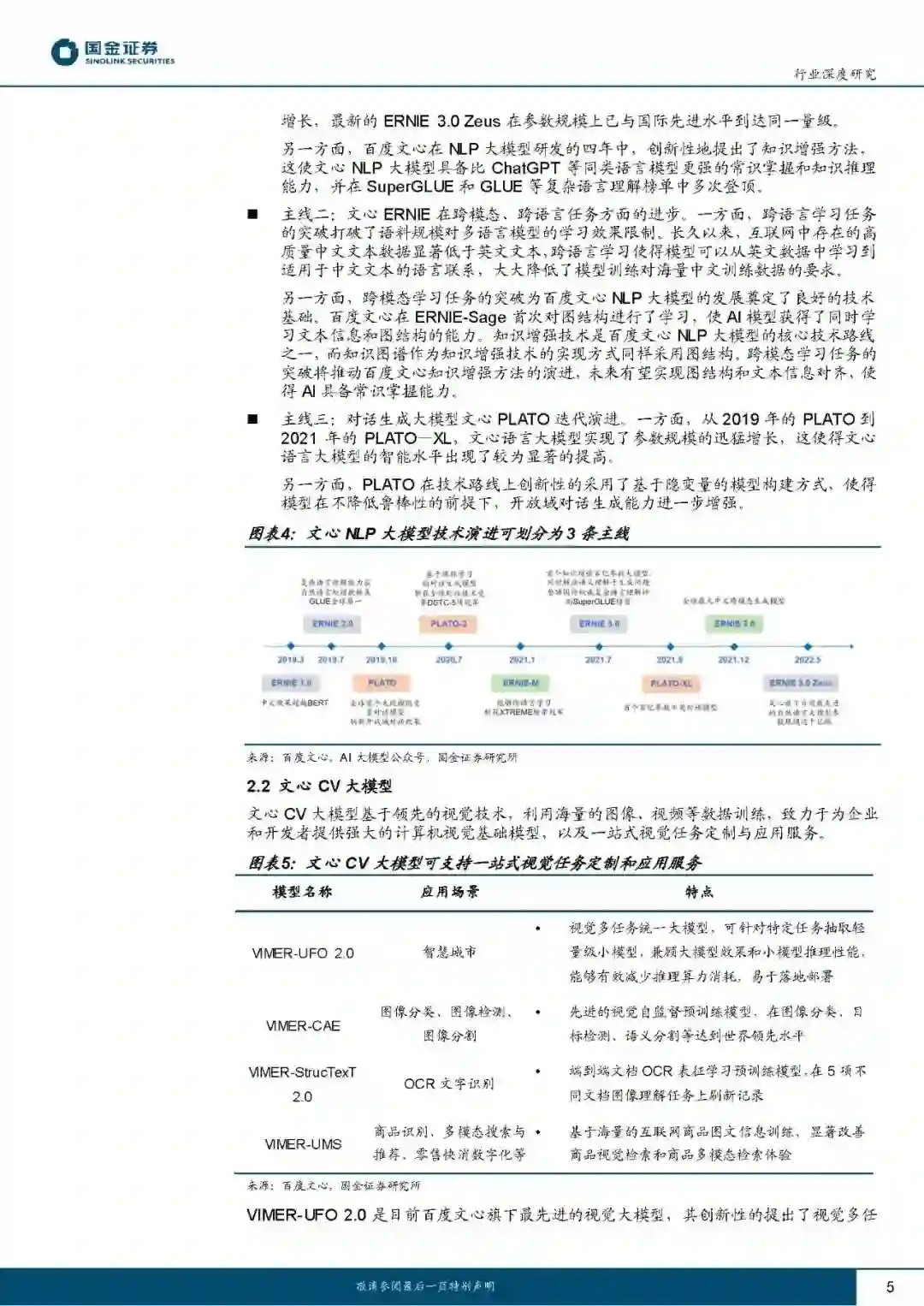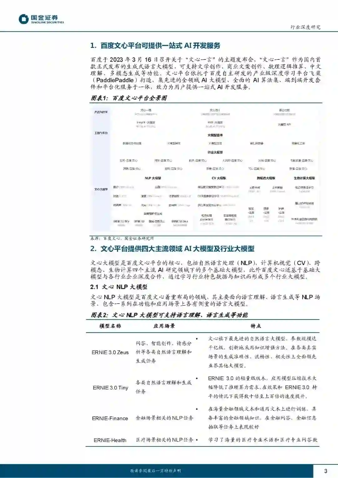 百度于2023年3月16日召开关于“文心一言”的主题发布会,“文心一言”作为国内首款正式发布的生成式语言大模型,拥有文学创作、商业文案创作、数理逻辑推算、中文理解、多模态生成等功能。文心平台依托于百度自研的产业级深度学习平台飞桨(PaddlePaddle)打造,致力于为用户提供一站式AI开发服务: AI大模型与行业大模型:文心平台提供NLP、CV、跨模态、生物计算四大主流AI研究领域的多个基础大模型,多个模型在技术层面实现突破创新,处于世界领先水平。其中,NLP领域的ERNIE3.0Zeus采用自回归网络和自编码网络,能够兼顾自然语言理解和生成功能;CV领域的VIMER-UFO2.0使用超网络结构,推理时仅需激活总参数量的1/30;ERNIE-ViLG2.0引入基于语言和图像的知识增强算法,在文本图像生成任务中的表现已经超越了OpenAI旗下的DALLE-2。文心平台与各行业企业联手打造行业大模型,目前已覆盖能源、金融、航天、制造、传媒、城市、社科、电影等8个领域。目前已有650余家知名企业宣布接入“文心一言”,涵盖企业服务、金融IT、汽车、传媒、教育、家电、金融等10余个行业。 一站式开发平台与开发工具:开发平台方面,文心面向专业知识有限的AI应用开发者提供零门槛平台EasyDL,面向专业开发者提供全功能平台BML。目前这两个平台均仅支持使用百度文心的云端算力,可采用公有云、私有化离线、软硬一体等部署方式。开发工具方面,文心提供ERNIEKit自然语言处理开发工具及PaddleFleetX全流程开发套件。此外,现阶段文心平台还向开发者免费提供大模型API。 产品与社区:百度文心通过构建产品与社区经营,对外展示生成式模型的强大性能,以此吸引爱好者投入创作,进而构筑成熟的AIGC社区,可在实践中探索AI商业化模式。目前除“文心一言”外,文心平台提供产业级搜索系统“文心百中”、艺术创意辅助平台“文心一格”,以及采用众创模式的旸谷社区。 目前百度文心生成式语言大模型在参数规模、技术创新、应用落地方面均在国内同业中处于领先水平。3月16日起,“文心一言”首批用户可通过邀请测试码接入体验,同时百度智能云将面向企业客户开放“文心一言”API调用接口,有望进一步丰富百度AI生态,赋能更多行业伙伴。