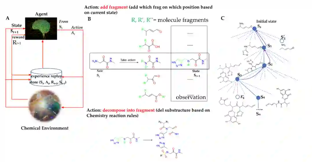 ——背景——新冠病毒的肆虐给人类的生命健康和经济发展带来了重大威胁,研究者们也在针对新冠病毒的特效药上投入了大量的时间和精力,但目前安全有效的治疗策略仍有待进一步开发。而SARS-CoV-2 3CL蛋白酶(亦称主蛋白酶)由于其在病毒复制中发挥着关键作用、序列和结构高度保守以及在人体内不存在同源类似物等特点,成为了新冠特效药开发中最有前景的靶点之一。现今针对SARS-CoV-2 3CL蛋白酶小分子抑制剂的研究主要分为利用经验进行理性设计、高通量实验筛选、分子对接虚拟筛选、人工智能辅助的虚拟筛选等几类方法。目前报道的人工智能辅助的方法主要以建立抑制剂分子的活性分类模型为主,而今年5月,美国密苏里大学的许东教授和厦门大学的吴振教授课题组合作在Biomolecule上发表了题为“AI-Aided Design of Novel Targeted Covalent Inhibitors against SARS-CoV-2”的文章,提出了一种基于强化学习Q-learning的共价抑制剂分子生成策略。——方法——****数据集文章收集了所有已报道的SARS-CoV 3CL蛋白酶抑制剂分子共284个,随后用RDKit中的BRICS算法拆解分子,并按照片段质量 < 200 Da、非氢原子在1-25之间等条件过滤,最后得到了包含316个片段的分子片段库。模型框架文章将深度Q-learning网络与基于片段的药物设计结合提出了一种用于先导化合物生成的计算框架ADQN-FBDD,模型架构如图1所示。强化学习是关于决策的科学,其核心是通过采取动作来获得最多的奖励。Q-learning是强化学习中一种value-based的算法,其主要思想是将状态state、动作action以及在状态s下采取动作a所获取的收益期望Q(s,a)构建成一张表格Q table,根据Q值来选取能够获得最大收益的一系列动作。