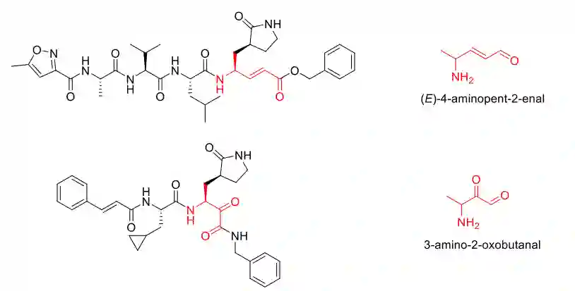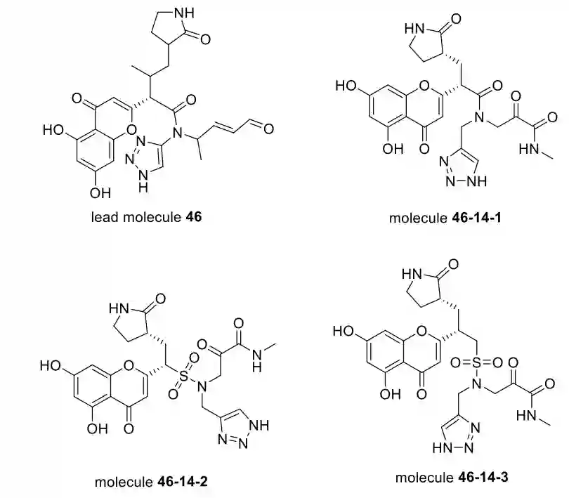 图2 初始结构示意图**——结果——文章使用上述的ADQN-FBDD模型自动生成了4922个有效结构,根据类药性>0.1和奖励函数R(s)>=0.6过滤得到了47个分子。随后对这47个分子进行了非共价对接、共价对接、共价与非共价对接的结合构象RMSD差异以及聚类分析,最终选择了分子#46(共价对接分数:-8.722 kcal/mol,RMSD: 1.71 Å)作为先导分子,并参照辉瑞PF-00835231、PF-07321332分子与蛋白的结合模式,用甲酰胺代替了醛,α-酮酰胺代替了 1,4 Michael 受体,得到46-14-1**;为了进一步提高分子极性,将酰胺替换成磺酰胺,得到46-14-2;为了提高分子的柔性,再在磺酰胺旁的碳链上延长一个碳原子,得到46-14-3(如图3所示),相关合成及验证实验正在进行中。