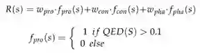 图1 ADQN-FBDD模型框架图(A)强化学习示意图。(B)基于片段的工作举例。(C)状态更新路径示意图在文章中,每个状态就是一个分子结构图,给定一个初始结构,可选的动作有从片段库中选择增加片段、删除片段和不做改动三种。决定动作后,下一个状态的分子结构由SMARTS预定义的45条化学反应规则生成。生成状态的奖励函数由最终属性得分、特定片段得分(CSF)和药效团得分组成: 其中,fpro代表类药性(QED),基于8个分子特征计算得来,取值在0到1之间;wpro代表类药性的权重,默认值是0.1;fcon代表特定片段得分fCSF,其计算式如下: