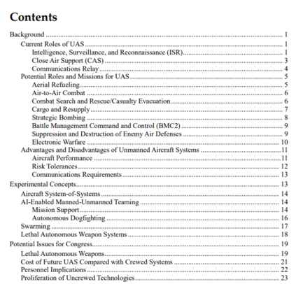 此外,美国防部正在开发一些实验概念,如飞机系统体系、群集和致命自主武器,以探索使用未来几代无人机的新方法。在评估潜在新的和未来无人机项目、任务和概念的拨款和授权时,国会可能会考虑以下问题: