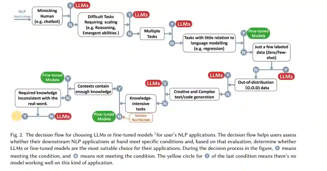 近年来,大型语言模型的快速发展正在彻底改变自然语言处理领域[12, 128, 131]。这些强大的模型在处理各种NLP任务方面表现出巨大潜力,从自然语言理解(NLU)到生成任务,甚至为人工通用智能(AGI)铺平了道路。然而,有效且高效地利用这些模型需要对它们的能力和局限性以及NLP涉及的数据和任务有实际的了解。 为了为从业者和终端用户提供指导,本研究关注于在下游自然语言处理任务中与大型语言模型(LLMs)合作的实际方面。本指南旨在提供实用建议,说明为何在给定任务中选择或不选择LLMs,以及如何选择最合适的LLM,考虑到诸如模型大小、计算需求以及领域特定预训练模型的可用性等因素。从实际角度深入了解LLMs,因此,为从业者和终端用户提供了成功利用LLMs处理自己的NLP任务所需的实用知识。