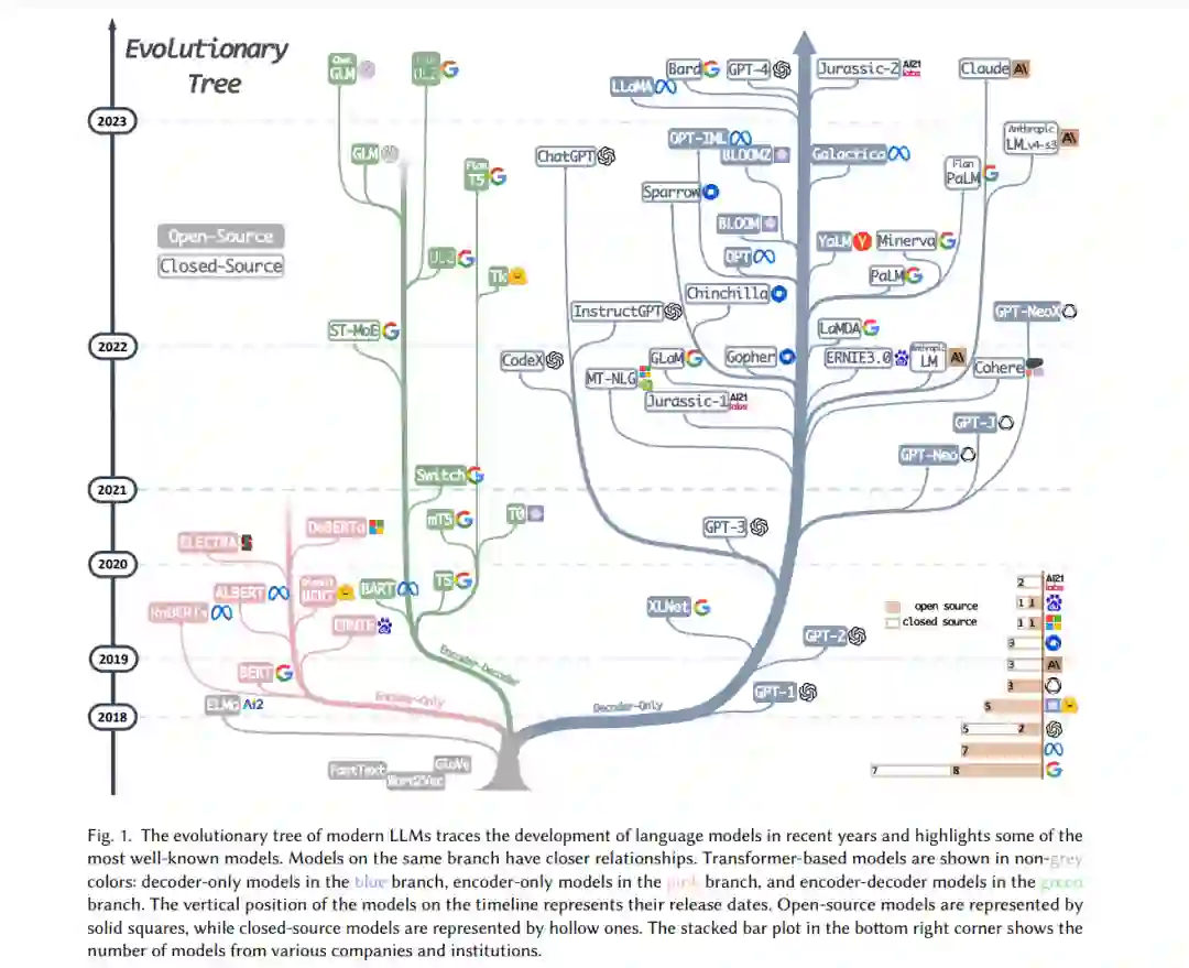 b) OpenAI始终保持着在LLM领域的领导地位,无论是现在还是可能的未来。其他公司和机构在开发与GPT-3和当前的GPT-4相媲美的模型方面,都在努力迎头赶上OpenAI。这个领导地位可以归因于OpenAI对其技术路径的坚定承诺,即使最初并未得到广泛认可。c) Meta在开源LLM方面做出了巨大贡献,并推动了LLM的研究。在考虑到对开源社区的贡献时,尤其是与LLM相关的贡献,Meta是最慷慨的商业公司之一,因为Meta开发的所有LLM都是开源的。d) LLM呈现出封闭来源的趋势。在LLM发展的早期阶段(2020年之前),大多数模型都是开源的。然而,随着GPT-3的推出,越来越多的公司选择封闭源代码模型,如PaLM、LaMDA和GPT-4。因此,学术研究人员在LLM训练方面的实验变得更加困难。因此,基于API的研究可能成为学术界的主导方法。e) 编码器-解码器模型仍具有潜力,因为这种类型的架构仍在积极探索中,而且大多数都是开源的。谷歌为开源编码器-解码器架构做出了实质性贡献。然而,仅解码器模型的灵活性和通用性似乎使得谷歌对这个方向的坚持变得前景不太明朗。