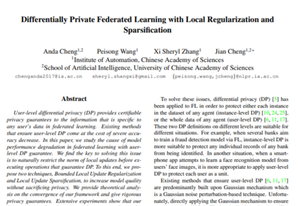 用户级差分隐私能够为联邦学习中任一用户的数据提供可认证的隐私保证。然而,现有的确保用户级差分隐私的方法都以严重损害模型精度为代价。论文研究了造成这种损害的原因,发现解决这个问题的关键是在执行保证差分隐私的操作之前,自然地限制本地权重更新的范数。基于这一观察,论文提出了有界局部更新正则化和局部更新稀疏化两种技术,以达到在不牺牲隐私的前提下提高模型精度的目标,对框架的收敛性和隐私性进行了理论分析。大量的实验表明,该框架显著地改善了隐私与精度之间的权衡。