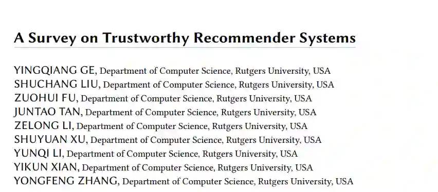 本综述总结了当前可信推荐系统研究的发展和趋势,旨在促进和推进未来可信推荐系统的研究和实施。本综述从技术角度为全面开发值得信赖的推荐系统提供了路线图。我们首先定义推荐系统的可信性,并通过对可信性原则的分类来说明它们的特点。随后,我们从可解释性、公平性、隐私性、可控性和鲁棒性等方面介绍并讨论了可信推荐系统的最新进展。我们描述了每个组成部分的基本思想,详细概述了每个组成部分的现有方法,并建议了这些组成部分未来的研究方向,特别是从跨方面的角度。总的来说,值得信赖的推荐系统的研究领域是重要的,并且随着一系列不同的方法和应用而蓬勃发展,同时,使推荐系统负责任和值得我们信任是我们的研究界需要应对的最大挑战之一。我们希望这项综述能够为这一领域感兴趣的研究人员提供足够的背景和知识来迎接这一挑战。
