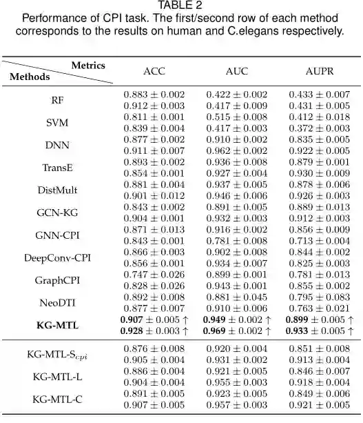 CPI实验 表2列出了CPI任务的比较结果。结果表明KG-MTL在human和C.elegans数据集上的性能均优于所有基线方法。更具体地说,KG-MTL在AUC指标上实现了至少2.6%、在AUPR指标上实现了至少1.1%的性能提升。同时,与human数据集中的GNN-CPI(第二好方法)相比,KG-MTL获得了94.9%的最佳AUC分数,绝对增益至少为3.3%。这种改进归因于DTI模块带来的丰富信息,该模块可从知识图谱中提取药物实体的丰富语义关系,而其他基于图的方法(例如GNN-CPI和NeoDTI)仅从化合物的分子结构或药物相关网络的拓扑结构中学习嵌入表示。同时,与直接采用知识图谱信息而忽略分子结构的KG模型(即TransE、DistMult和GCN-KG)相比,KG-MTL通过Shared Unit模块进一步融合知识图谱信息和分子图结构,从而获得更好的预测性能。