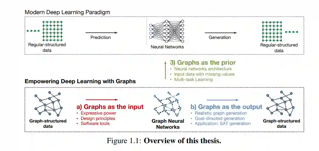 在本文中,我们的目标是用图结构数据增强深度学习。我们的愿景是为图形结构数据构建一个表达性强、使用方便的深度学习框架。我们希望这样一个框架可以将深度学习在规则结构化数据上的成功转化为图结构数据,图结构数据代表了更通用、更灵活的数据格式。同时,我们将展示一个成功的图的深度学习框架,进而推动深度学习研究的总体进展。为了实现这些目标,我们建议赋予深度学习框架以能力,使其能够将图作为输入、输出和先验。图1.1总结了三个研究方向。