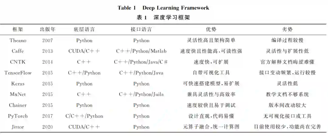 为了实现更复杂的模型,若从头开始编写代码, 效率非常低,因此深度学习框架应运而生.本节介绍 常用的深度学习框架,并将其汇总于表1中. 目前常用于点云处理的框架更多为 TensorFlow 与 PyTorch,其他框架如 Caffe与Jittor等也可用于 处理点云,但应用较少.