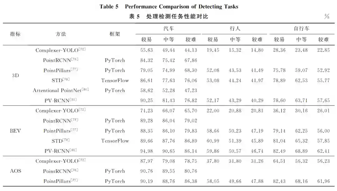 跟踪算法中,文献[67]主要关注的是物体部件 的跟踪,文献[68]与文献[69]则主要检测同一物体 在不同时间的状态.文献[67]的优势在于可以同时 预测多个运动部件及其各自的运动信息,进而产生 基于运动的分割.该方法实现高精度的前提是输入 对象的几何结构明确,否则很有可能会生成不完美 的运动序列.文献[68]在快速变化的情况下,如突然 刹车或转弯,其结果仍可靠.但是当目标被严重遮挡 时,其结果并不可靠.由于大多数模型(如汽车模型) 只能从单侧看到,文献[69]利用对称性完善汽车形 状的方法未必是有效的.文献[71]的处理方法较简 单且用时较短,在 CPU 上运行时间不超过75ms.它 能在检测行人时达到较高性能.但用于拥挤道路的 自动驾驶时,其采用的质心估计对于汽车并不准确. 文献[72]同时利用2维信息与3维 LIDAR 数据, 且使用的SRTs指标可缩短训练时间. 场景流估计算法中,文献[73]联合3维场景流 和刚性运动进行预测,其效率较高且处理不同运动 时具有鲁棒性.文献[74]与文献[75]都以端到端的 方式从点云中学习场景流.前者从非结构化的点云 中恢复结构化,在生成的网格上进行计算,后者则是 在点云的连续帧中计算. 检测算法中,文献[76]不会在量化过程中丢失 信息,也不需要依赖2维检测来估计3维包围盒,故 而可以充分利用3维信息.文献[77]的处理速度较 快,计算效率较高.文献[78]具有较高的计算效率和 较少的计算量,能够同时集成基于点和基于体素的 优点.文献[79]引入局部特征作为网络输入,有助于 充分了解输入点云的局部结构.文献[80]能够有效 地获取数据的3维几何信息.但是,将点云裁剪成较 小区域等预处理步骤增加了计算成本.文献[81]结 合了基于体素与基于 PointNet的优点,不仅保留了 精确的位置,而且编码了丰富的场景上下文信息.