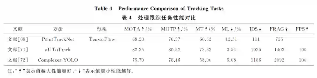 目标跟踪是推测帧的属性并预测变化,即推断 对象的运动情况,可以利用预测对象的运动信息进 行干预使之实际运动符合预期目标或用户要求. 为了从点云中推断出目标对象的可移动部件以 及移动信息,2019年 Yan等人[67]提出 RPMGNet.其 特定的体系结构够预测对象多个运动部件在后续帧 中的运动,同时自主决定运动何时停止. 2020年 Wang等人[68]提出 PointTrackNet.网 络中提出了新的数据关联模块,用于合并2帧的点 特征,并关联同一对象的相应特征.首次使用 3 维 Siamese跟踪器并应用于点云的是 Giancola等人[69]. 基于 Achlioptas等人[70]提出的形状完成网络,2019 年 Giancola等人[69]通过使用给定对象的语义几何 信息丰富重编码后的表示来提高跟踪性能. 2019年Burnett等人[71]提出aUToTrack,使用 贪婪算法进行数据关联和扩展卡尔曼滤波(extended Kalmanfilter,EKF)跟踪目标的位置和速度.Simon 等人[72]融合2维语义信息及 LIDAR 数据,还引入 了缩放旋转平移分数(scaleGrotationGtranslationscore, SRTs),该方法可更好地利用时间信息并提高多目 标跟踪的精度. 文献[67]可以从开始帧和结束帧的移动部分导 出变化范围,故参数中不含变换范围,减少了参数个 数.文献[68]提供的跟踪关联信息有助于减少目标 短期消失的影响,其性能比较稳定,但是当汽车被严 重遮挡时,结果会出现问题.文献[69]解决了相似性 度量、模型更新以及遮挡处理3方面的问题,但该方 法直接利用对称性来完善汽车整体形状会导致更多 噪声.文献[71]实际需要计算被检测物体的质心,这 种方法能有效检测行人,但对于汽车来说,其结果并 不准确.文献[72]提出的 SRTs可用于快速检测目 标,提高了准确性和鲁棒性.