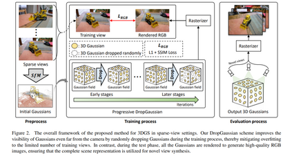 最近,3D 高斯溅射(3DGS)因其快速的性能和优秀的图像质量在新视角合成领域引起了广泛关注。然而,在稀视角设置下(例如,三视角输入),3DGS 经常面临过拟合训练视角的问题,这显著降低了新视角图像的视觉质量。许多现有方法通过使用强先验来解决这一问题,如 2D 生成的上下文信息和外部深度信号。与此不同,本文提出了一种无先验的方法——DropGaussian,通过对 3D 高斯溅射进行简单的改动。具体而言,我们在训练过程中以类似于 dropout 的方式随机删除部分高斯分布,这使得未被删除的高斯分布能够拥有更大的梯度,同时提高它们的可见性。这使得剩余的高斯分布在稀输入视角的渲染优化过程中能做出更多贡献。如此简单的操作有效地缓解了过拟合问题,并提升了新视角合成的质量。通过将 DropGaussian 简单应用于原始的 3DGS 框架,我们能够在基准数据集的稀视角设置下,获得与现有基于先验的 3DGS 方法相媲美的性能,而无需额外的复杂性。代码和模型可通过以下链接公开获取:https://github.com/DCVL-3D/DropGaussian release。