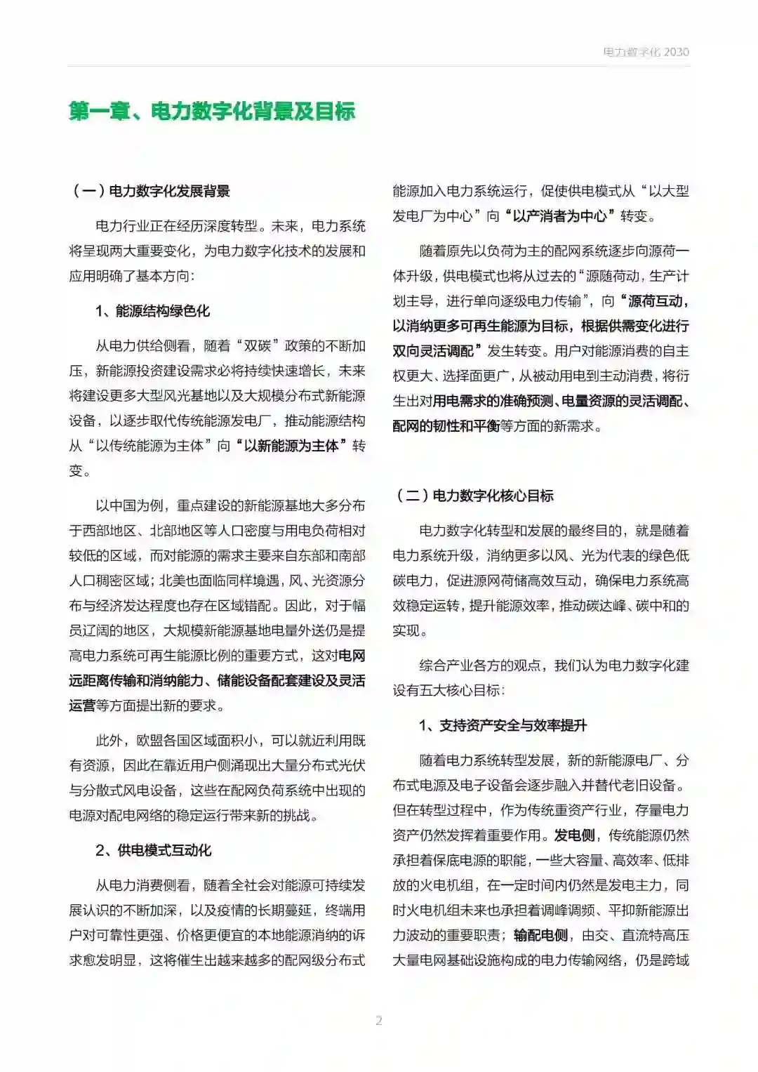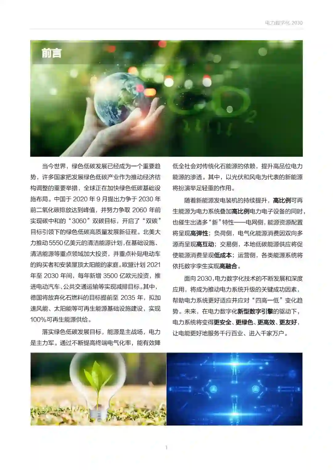 《电力数字化2030》报告描绘通过数字化技术与电力技术的深度融合构建起电力系统数字孪生蓝图;围绕源网荷储一体协同新形态下数字绿色电厂、电网数字巡检、多源自愈配网、多能协同互补、跨域电力调度、赋能绿色低碳六大核心业务场景进行了详细分析;从数字化边端、泛在通信网络、算力和存储、算法和应用四大数字化技术应用领域寻找技术支撑;提出绿色网络、安全可靠、泛在感知、实时网联、智能内生、服务开放的六大电力数字化技术特征;并建议通过构建基于云边协同的技术架构,打造开放、高效、智能的电力数字化新引擎,支撑并驱动电力系统升级转型,加速新能源消纳,推动“双碳”目标的实现。