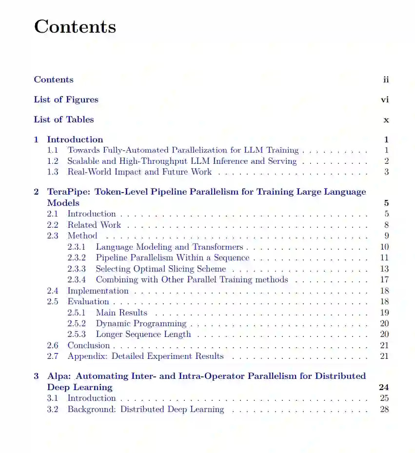 首先,我们介绍了一些系统来优化计算效率并减少分布式LLM训练的工程开销。我们开发了TeraPipe,提出了一种新的维度来进行LLM的流水线并行训练,并且还开发了Alpa,这是世界上首个能够自动分配任意神经网络并支持所有现有并行化方法的编译器。