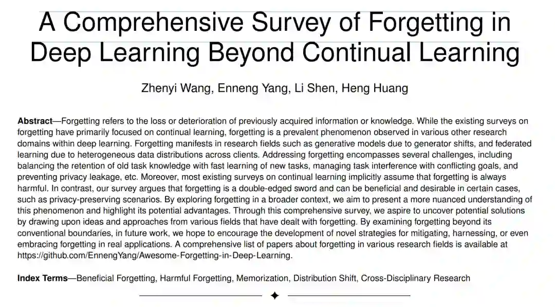 遗忘指的是以前获得的信息或知识的丧失或退化。尽管现有的关于遗忘的调查主要集中在持续学习上,但在深度学习的各种其他研究领域中都观察到了遗忘这一普遍现象。遗忘在诸如生成模型(由于生成器的变化)和联合学习(由于客户端之间的异质数据分布)等研究领域中都有表现。解决遗忘涉及多个挑战,包括平衡保留旧任务知识与快速学习新任务的能力、管理具有冲突目标的任务干扰以及防止隐私泄漏等。此外,大多数关于持续学习的现有调查都暗示遗忘始终是有害的。与此相反,我们的调研认为遗忘是一把双刃剑,在某些情况下,如保护隐私的场景中,遗忘可能是有益的和可取的。通过在更广泛的背景下探索遗忘,我们旨在呈现对这一现象的更为细致的理解,并突出其潜在的优势。通过这一全面的综述,我们希望通过吸取各领域处理遗忘的思路和方法来发掘潜在的解决方案。通过超越其传统界限来检查遗忘,我们希望在未来的工作中鼓励开发新策略,以减轻、利用或甚至在真实应用中接受遗忘。关于各研究领域中遗忘的论文的全面列表可在https://github.com/EnnengYang/Awesome-Forgetting-in-Deep-Learning 上找到。