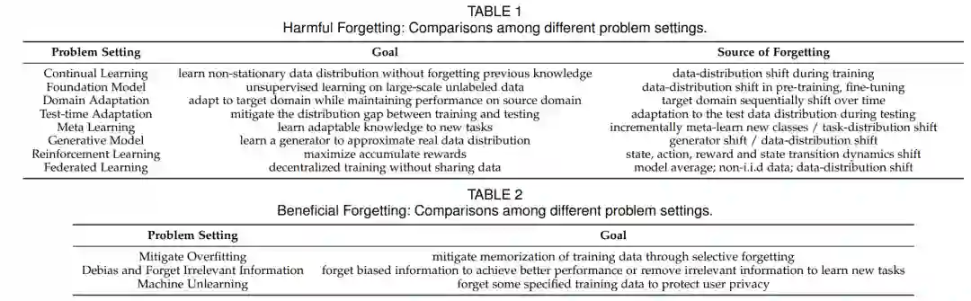 现有关于遗忘的调查主要集中在CL上[2]、[3]、[4]、[5]、[6]、[7]、[8]、[9]。然而,这些调查往往只关注遗忘的有害效果,而缺乏对该话题的全面讨论。与此相反,我们的调查旨在提供对遗忘的更全面的理解。我们强调了它作为双刃剑的双重性质,强调其益处和害处。此外,我们的调查超出了CL的范围,涵盖了其他各个领域中的遗忘问题,包括基础模型、领域适应、元学习、测试时适应、生成模型、强化学习和联邦学习。通过这样做,我们提供了一个全面的遗忘检查,涵盖了更广泛的背景和应用范围。在这次调查中,我们将机器学习中的遗忘分为两类:有害遗忘和有益遗忘,具体取决于特定的应用场景。当我们希望机器学习模型在适应新任务、领域或环境时保留以前学到的知识时,就会发生有害的遗忘。在这种情况下,防止和减轻知识的遗忘是很重要的。相反,当模型包含可能导致隐私泄露的私有信息,或者当无关的信息妨碍新任务的学习时,就会出现有益的遗忘。在这些情况下,遗忘变得是可取的,因为它有助于保护隐私,并通过丢弃不必要的信息来促进有效的学习。
