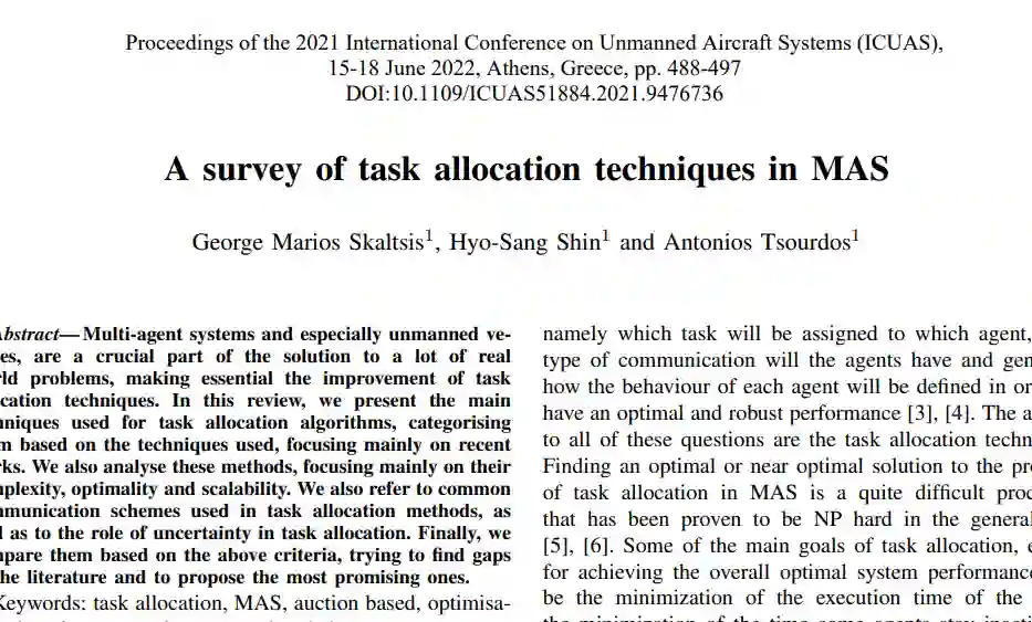 多Agent系统,尤其是无人驾驶系统,是解决很多现实问题的关键部分,因此必须改进任务分配技术。在这篇综述中,我们介绍了用于任务分配算法的主要技术,并根据所使用的技术对其进行了分类,主要侧重于最近的工作。我们还分析了这些方法,主要集中在它们的复杂性、优化性和可扩展性上。我们还提到了任务分配方法中使用的常见通信方案,以及任务分配中不确定性的作用。最后,我们根据上述标准对它们进行了比较,试图找到文献中的差距,并提出最有希望的方法。