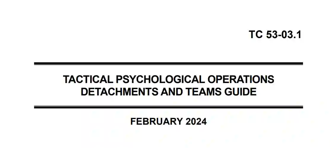 TC 53-03.1 解释了战术心理作战分队和 TPT 在稳定行动、作战行动和人道主义支持期间支持常规部队和特种作战部队的作用和职能。它还详细介绍了心理作战部队如何支持其他联合军种的信息和影响相关活动并与之互动。本指南代表了美国陆军心理作战部队从作战到战术层面开展和执行与影响力活动相关任务的训练标准。