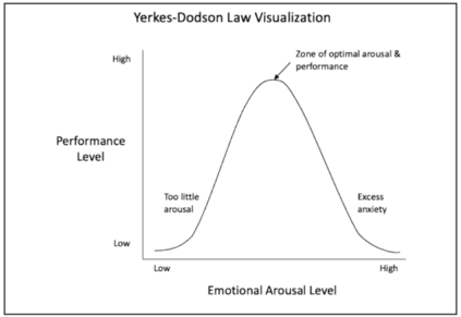 情绪的唤醒程度直接影响认知表现。1908年首次提出的耶克斯-多德森定律(Yerkes-Dodson Law)为这一现象提供了一个基本模型,并描述了一个与巅峰表现相关的认知唤醒的甜蜜点。正确的唤醒水平,或压力,会使大脑释放正确的神经化学物质组合,以产生最佳表现所需的警觉性和注意力。优秀的教练认识到唤醒水平对表现的影响,并在比赛期间根据需要成功地使球队平静下来或振作起来。太少会让我们变得平淡无奇,而太多则会产生适得其反的压力、焦虑或脱离。军队领导人可能熟悉这种现象,在战斗情况下,身体的威胁会激起强大的反应,但在工作压力和信息过载的情况下也会出现类似的状态。