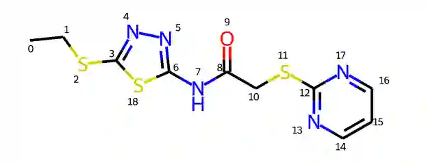 直接生成3D分子构象存在两个挑战:一是保持生成构象坐标的旋转平移不变性,二是对称原子的坐标的置换不变性。以图一中的分子为例进行说明。(1)如果任意旋转或者平移整个分子构象的坐标,分子构象应该具有不变性。在损失函数中,应体现为旋转平移后的构象和标准构象的误差应保持一致。(2)图一中的分子右侧的嘧啶(由原子12~17组成)应该沿着11-12的碳硫键具有对称性。也就是,如果将原子13、17的坐标对调,同时也对调原子14、16的坐标,分子构象应该保持不变。我们将一个分子中所有对称部分的置换操作记做。对图一来说,