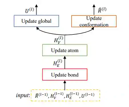 除此之外,作者提出一种新的图神经网络结构,如图二所示。网络的每一层包含四个模块,它们工作方式如下:(1)对于每一个化学键,利用它两个端点的原子特征去更新该化学键的特征;(2)对于任意原子,利用和它相邻的化学键去更新原子的特征;(3)利用刚刚更新的原子和化学键特征去更新分子的一个整体表达(4)根据每个原子特征,预测它的坐标。分子的构象逐层优化,最终实现从一个初始随机噪声,得到一个真实分子构象。