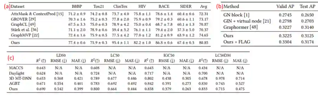 在表2中,作者展示了若干分子属性预测任务的结果。表2(a)和2(b)展示的是在moleculeNet和OGB-molpcba上预测的结果。这两个数据集都是只有2D图信息,没有3D信息。表2(c)展示的是在一个毒性预测数据集上我们算法的效果,该数据集中的分子具备3D信息。