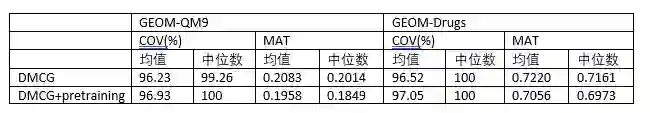 在2D分子图到3D构象生成的任务上,作者和未经过预训练的版本进行了对比。经过预训练后,在3D构象生成的任务上也取得了显著提升。